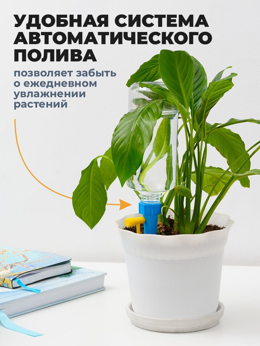 Капельный полив для цветов позаботится о ваших растениях, пока вы в отъезде или на работе. Простая и понятная система автополива заменяет ручной труд и самостоятельно поддерживает необходимую влагу в земле. Такая поливалка для цветов — настоящее спасение, если вас регулярно нет дома или вы просто забываете вовремя поливать цветы. Капельный полив для цветов происходит за счет насадки на бутылку для полива растений и краника, который к ней присоединяется.